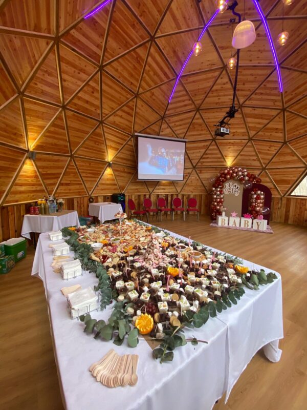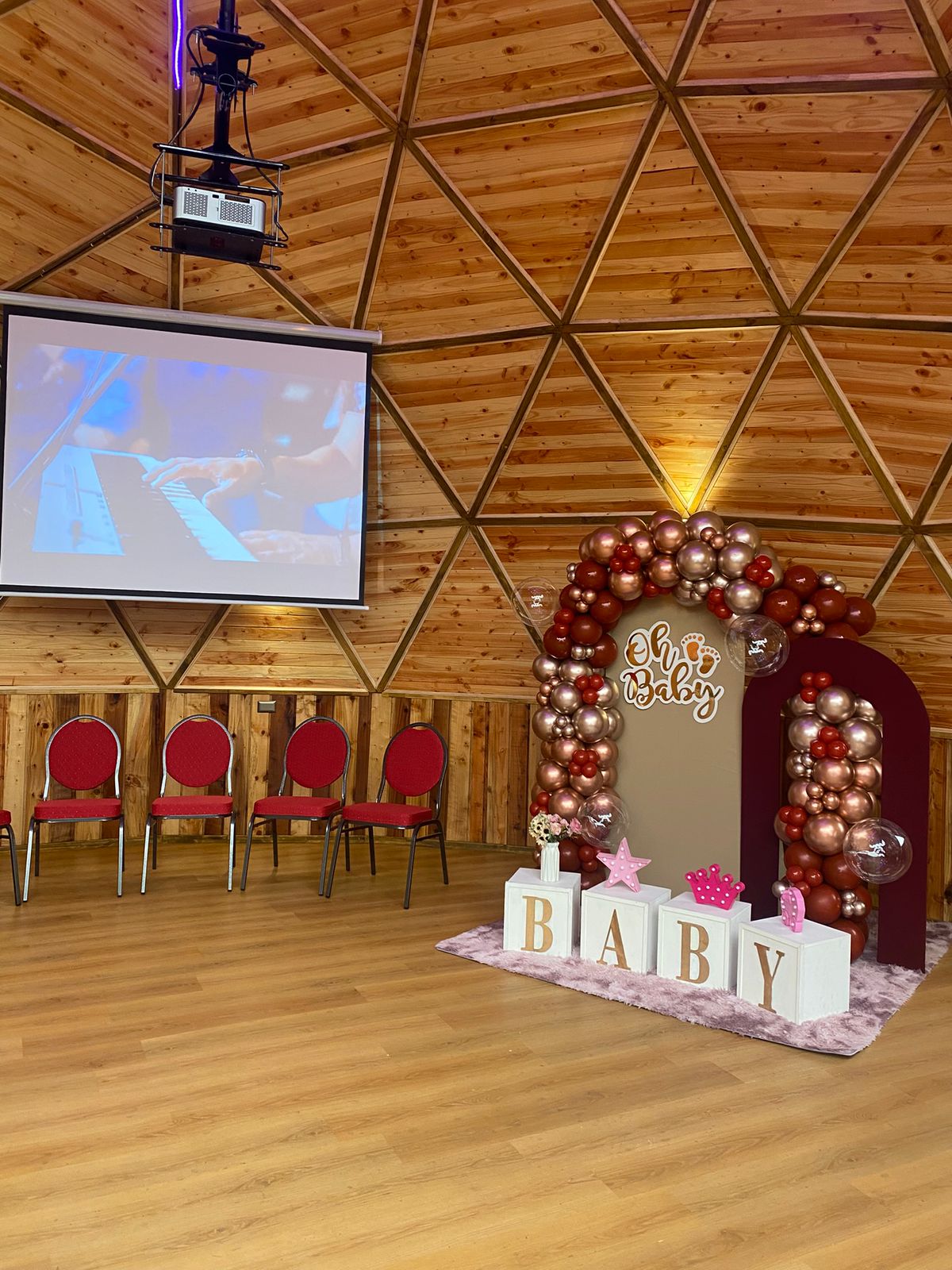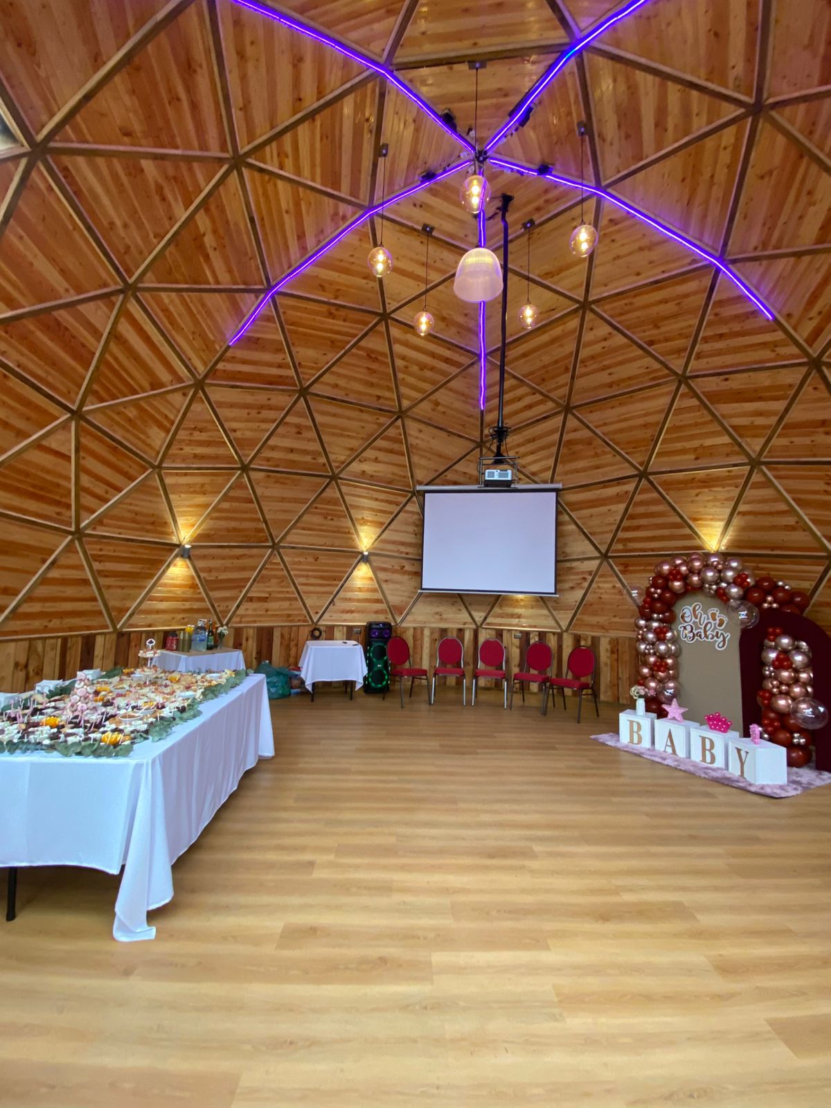 Capacidad: Hasta 70 personas en domo, ambiente cerrado y climatizado, también pueden ser mas personas, ubicadas en toldos y carpas de eventos dentro del mismo entorno.